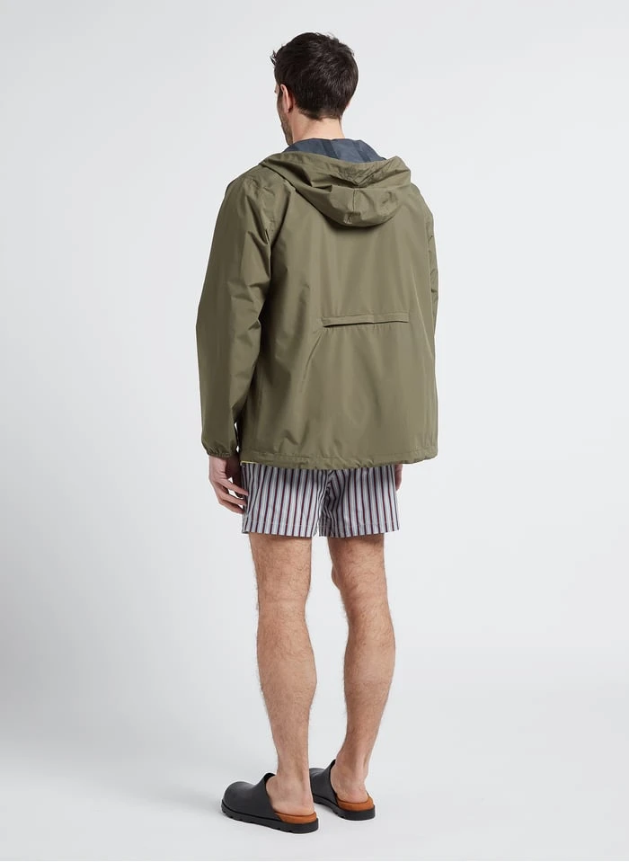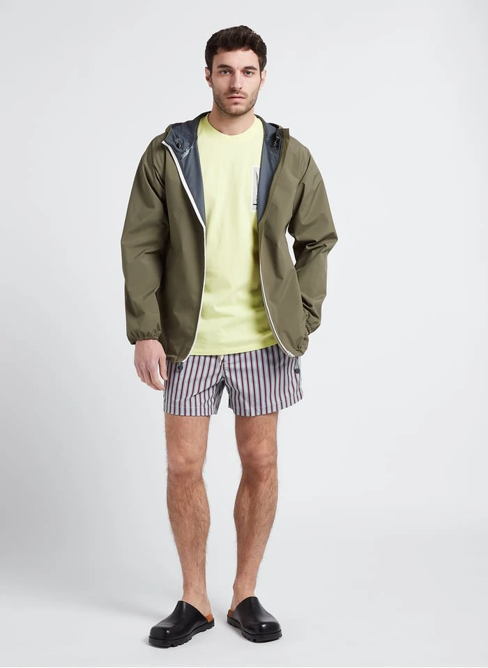 Dit model wordt aangeboden met Platte, leren slippers by CAMPER, Katoenen T-shirt by EDWIN, Korte regenjas met capuchon by FLOTTE
